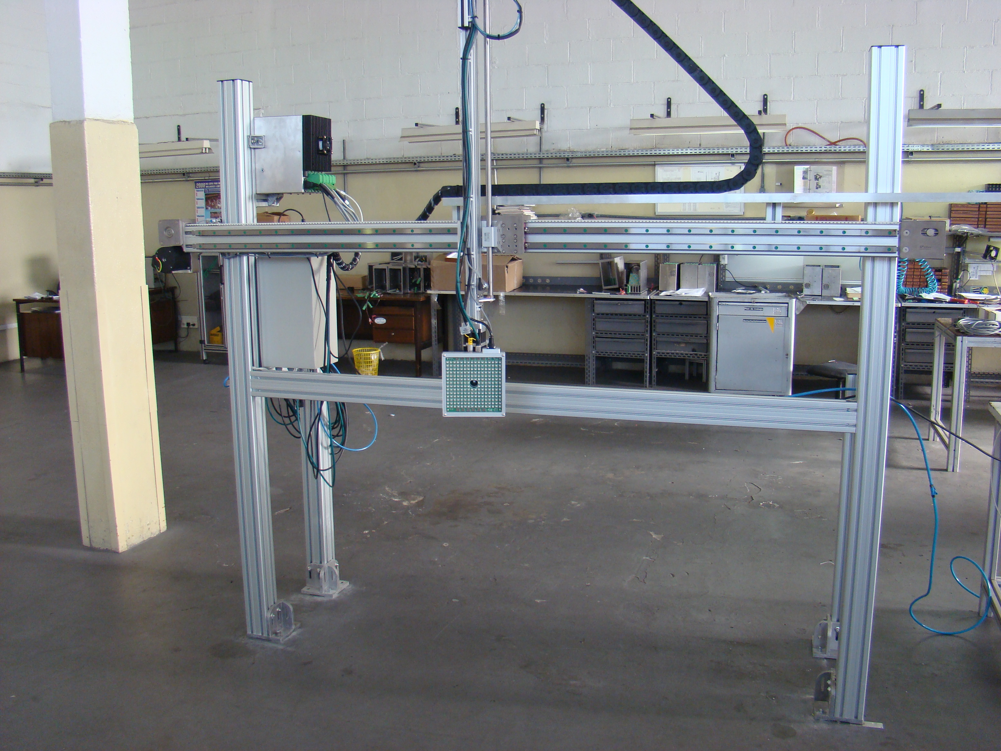 O equipamento consiste em movimentador XY com perfis de alumínio, guias lineares, patins com esferas circulantes, correias com alma de aço, motores de passo, sensores de zero e esteiras porta-cabos. Sua medidas são de 500mm de curso útil cada eixo, tendo eixo vertical Z com perfis de alumínio, guia linear, patins com esferas circulantes, correia com alma de aço, motor de passo, sensor de zero e esteira porta-cabo. Possui cilindro pneumático de contra-peso. Sua medidas é de 200mm de curso útil.